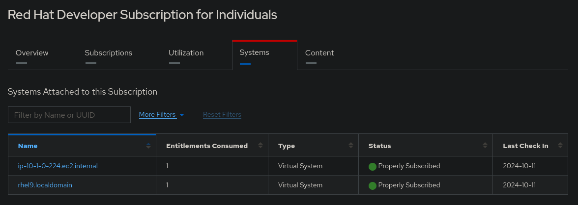 You can also see this server registered as an active system in your Red Hat Customer Portal - Subscriptions and then by navigating to the Systems tab: