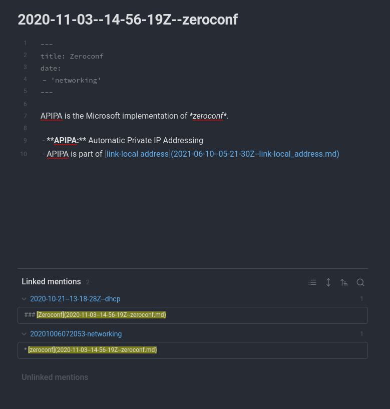 After a while, some of your notes start to accumulate back-links from other notes that are related to it. In Obsidian these are called “linked mentions” at the bottom of the note.